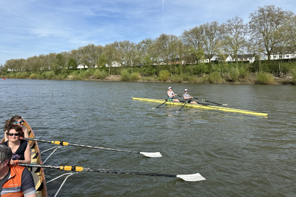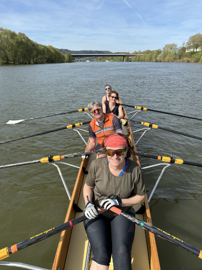 Nachdem Wadim die Vorräte im Kühlschrank des Clubhauses aufgefüllt hatte, konnte auch der dritte Vierer auf´s Wasser. Petra war nach einer langen Zwangspause überglücklich die Skulls rundgehen zu lassen. Conny steuerte den Viertakter durch den ruhigen toten Arm und konnte so das Boot von Oliver noch überholen. Derweil wurde der frisch renovierte Steg zu einer begehrten Touristenattraktion. Einige Boote drehten noch eine Extrarunde bis dann alle erfolgreich angelegt hatten.