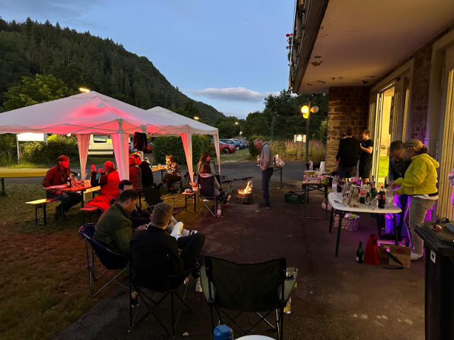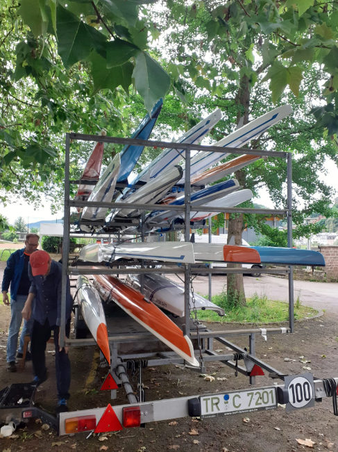 Bereits zum 4. Mal hatten Nils und Oliver zum Trainingslager nach Dreisbach eingeladen. Am Freitagabend wurde beschriftet, abgeriggert und der Anhänger mit Booten voll geladen. Am frühen Samstagmorgen ging es los – der Tross mit dem Bootsanhänger, gezogen vom Bus von Sebastian und natürlich das Kühl- und Getränkekommando starteten durch. Parallel bewegten sich weitere Rudernde gen Saarschleife – ein von langer Hand geplantes, logistisches Meisterwerk, wie wir spätestens am Abend, völlig relaxt an der Pink Flamingo Bar stehend, verstehen sollten.