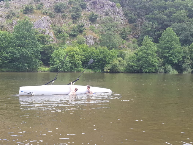 Doch auch sportlich war - wie gewohnt - einiges geboten! Dreisbach ist die ideale Gelegenheit für Alle – Anfänger wie Routiniers und auch Könner neue Bootsklassen und sich selbst im geschützten und betreuten Bereich zu erproben. Wovon reichlich Gebrauch gemacht wurde – auf und im Wasser! Aber genau darum geht es – wie bei Olivers Kentertraining am Sonntag. Jede und Jeder – ob alt ob jung, m.,w.,d., sollte die Erfahrung mindestens einmal machen, gezielt oder auch überraschend aus dem Boot zu fallen! Manche versuchen auch unkenterbare Boote zum Kentern zu bringen – wie die Jugend in Gestalt von Moritz und Cornelius. Nach anfänglichen Schwierigkeiten gelang es den Beiden auf eindrucksvolle Art und Weise und mit teils artistischen Einlagen den völlig überraschten Coastal-Zweier „Delight“ kieloben zu präsentieren. Selbstredend in mehreren Varianten und stets neuen Kenter-Techniken – da staunte auch Trainer Sebastian nicht schlecht ...