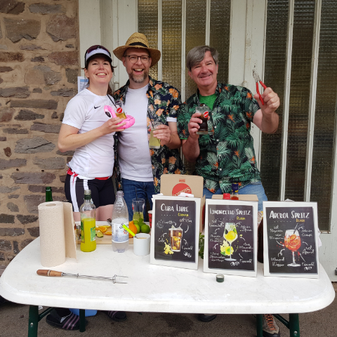 Und so wurde flussabwärts die Saarschleife bis zur Schleuse und flussaufwärts die Saar bis teils zur dritten Brücke in Kleinbooten und einem saarländischen Vierer erkundet. Während schon der Grill heiß lief und die Steaks von Cornelius und Moritz grammgenau abgewogen und zubereitet wurden, fiel dann auf, dass Heike fehlte. Hatte sie die Schleuse genommen oder wurde sie Opfer eines mehrere Meter großen Saar-Wallers? Nein, ein motorisiertes Suchkommando stellte fest, sie hatte nur die Abendstimmung sichtlich genossen und kam dann trotz weniger, saisonaler Ruderkilometer, sicher im Einer zurück. Perfekt passend zur Eröffnung der Pink Flamingo Bar wurde sie von Martin gleich mit einem Aperol erstversorgt.