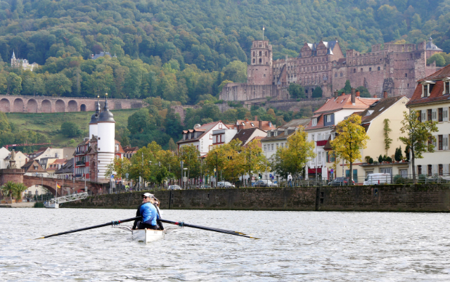 Ich glaube schon seit langem, dass ich täglich immer neues lernen sollte. Die erste pädagogische Herausforderung der Reise bestand noch vor der Abreise aus Irland nach Deutschland darin, herauszufinden, wie man nach Bad Wimpfen eigentlich gelangt, einem Ort, der (wie ich später erfuhr, völlig unverdient) im Dunkeln lag. Laut DB-App war die Stadt vom Flughafen Memmingen in knapp drei Stunden und mit nur drei Umsteigen erreichbar. Aber das Schicksal hatte für mich am Tag vor Beginn des Ruderns ein gründlicheres Aufwärmprogramm vorbereitet. Eine Zugverspätung machte den zweiten Anschluss unmöglich, aber die bewundernswert anpassungsfähige App leitete mich auf eine alternative Route um, die nicht weniger als fünf Zugwechsel erforderte, von denen zwei nur im Sprint zwischen den Bahnsteigen möglich waren.