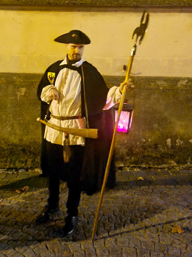 Der Tag hatte früh begonnen, als ich um 3 Uhr morgens halb bewusstlos aufgestanden war, um den Flughafenbus von Cambridge nach London Stansted zu nehmen. Der DB-Hindernisparcours verschlechterte meinen Zustand der Benommenheit noch weiter, und als ich Bad Wimpfen erreichte, war ich fast katatonisch. Kaum hatte ich begonnen, alle Eure Namen zu lernen, da wurden wir von einem fröhlich bedrohlichen Menschen in seltsamer Tracht, der sich nicht sicher zu sein schien, ob seine furchterregende Waffe nur dekorativer Natur war, durch die Antiquitäten der Stadt geführt. Seine Verwendung einer exotischen Variante des gesprochenen Deutsch, die mir bisher unbekannt war, verstärkte das Gefühl des Mysteriums und hinterließ bei mir möglicherweise ein verzerrtes Verständnis der glorreichen Vergangenheit von Bad Wimpfen. Es begann einen Sinn zu ergeben, als mir klar wurde, dass sich „Käsestadt“ auf den obersten Führer des Heiligen Römischen Reiches und nicht auf Emmentaler bezog. Was ich glaube zu verstehen, war, dass die Stadt dank ihrer tadellosen reformistischen Glaubwürdigkeit und trotz einer Vorliebe für die Zerstörung öffentlicher Denkmäler durch fehlgeleitete Versuche, sie zu verbessern und zu erhalten, jahrhundertelang weitgehende rechtliche Straflosigkeit genossen hatte, zumindest theoretisch, und deshalb bedauerte sie eher den Beginn der Moderne. Nun ja, vielleicht habe ich einiges davon richtig verstanden.