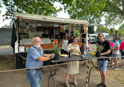 Dann eröffnete Gerhard Kolb das Buffet und an die hundert Menschen drängten sich bei heißen, sommerlichen Temperaturen aus dem Clubhaus in Richtung mobiler Imbisstand. Dort gab es leckeres Fast Food und vegane Pommes. Was wäre aber eine Feier ohne die leckeren Salate und Nachspeisen der vielen freiwilligen Vereins-Köchinnen und Köche! Den durstigen Ansturm wusste Clubhauswart Sascha jederzeit zu beantworten. Und so ließen wir den Tag ausklingen und den Verein hochleben. Unser besonderer Dank gilt allen, die zu diesem Festtag beigetragen und die RGT unterstützt haben.