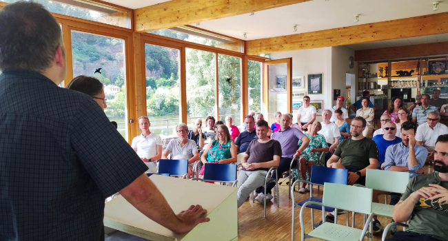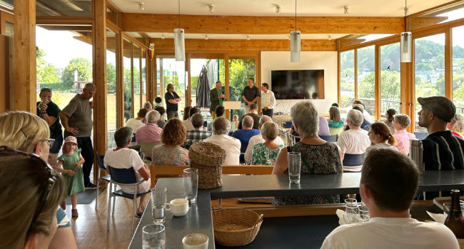 Um 16:00 Uhr waren dann alle auf den Festakt gespannt. Neben den zahlreich erschienenen Mitgliedern wurden auch Vertreterinnen und Vertreter der Nachbarvereine und aus Sport und Politik begrüßt. Für den Festvortrag waren Prof. Uwe Jun und Dr. Lasse Cronquist vom Trierer Institut für Demokratie und Parteienforschung eingeladen worden. Einleitend zitierte Gerhard Kolb verstörende Worte aus der Rede von Wilhelm Leinen zum 50- jährigen Bestehen der Rudergesellschaft im Jahre 1933. Leinen hatte lange Jahre den Vorsitz der RGT inne und war auch zeitweilig Schatzmeister des DRV (Deutscher Ruderverband). Kolb verurteilte die 90 Jahre alte Lobesrede von Leinen auf den Führer scharf und ordnete die historischen Ereignisse für die Zuhörer ein. Ohne Not war die RGT schon früh zur Gleichschaltung bereit gewesen. Da passte der Festvortrag mit dem Titel „Sportvereine als eine Stütze der Demokratie. Wie Vereine zur gesellschaftlichen und politischen Teilhabe von Bürgerinnen und Bürger beitragen“ ganz hervorragend. Jun und Cronquist zeigten auf, wie Sportvereine von autoritären und totalitären Regimen instrumentalisiert wurden und werden. Heute stellen Sportvereine eine wichtige Stütze unserer Demokratie dar, so die Referenten. Vereine als Orte des sozialen Austauschs können der zunehmenden Individualisierung und Polarisierung entgegenwirken. Engagement und Ehrenamt der Vereinsmitglieder sollten entsprechend auch gefördert und politisch gewürdigt werden, so das Fazit. Dem interessanten und engagierten Vortrag folgte eine ebenso angeregte Diskussion mit dem Plenum. Anschließend galt es viele Grußbotschaften zum Geburtstag des Vereins zu beklatschen und auch die Spende des Sportbundes Rheinland, überbracht von Michael Maxheim wurde freudig gefeiert.