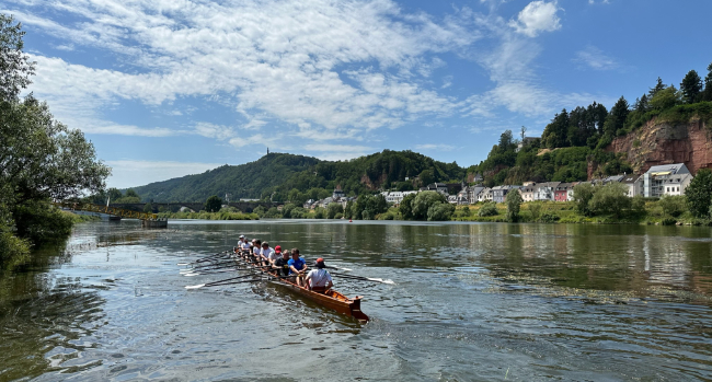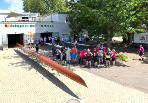 Am 08.07.23 feierte die Rudergesellschaft Trier ihr 140- jähriges Bestehen. Bei bestem Wetter hatte man die Tore der Bootshallen weit geöffnet und zahlreiche Personen aus Sport und Politik eingeladen. Viele Wimpel, Flaggen und Fahnen aus längst vergangenen Zeiten wehten vom Mast und deuteten auf die lange Geschichte des am 31. Mai 1883 gegründeten Vereins. Dem Anlass angemessen, stand zuerst die Taufe von zwei Einern an. Nach der Begrüßung durch den 1. Vorsitzenden, Gerhard Kolb, ging das Wort an die Bürgermeisterin und Sportdezernentin Elvira Garbes. Frau Garbes taufte einen von Klaus Kappes gespendeten Renneiner auf den Namen „Dat is et“ und wünschte ihm allzeit gute Fahrt. Für die Ruderabteilung trat Uwe Thein an und taufte den lagestabilen, neuen, breiten Einer auf den Namen „Explorer“. Die Anschaffung von „Explorer“ war nur durch viele kleinere Spenden der Mitglieder möglich.